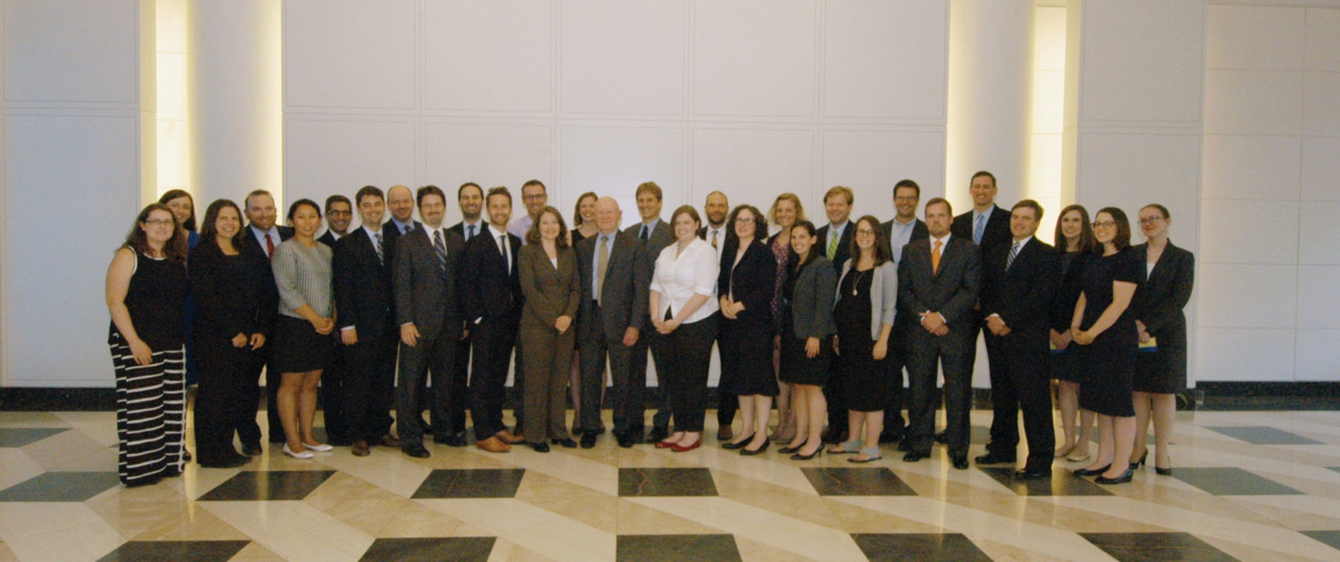 The 2016 Fellows are pictured below with Bob Fiske (left to right) Caroline Flynn, ’13, U.S. Department of Justice, Office of Legal Counsel; Ben Clark, ’14, Consumer Financial Protection Bureau; John Broderick, ’13, environment and natural resources division of the U.S. Department of Justice; and Megan DeMarco, ’16, New York County District Attorney’s Office.
