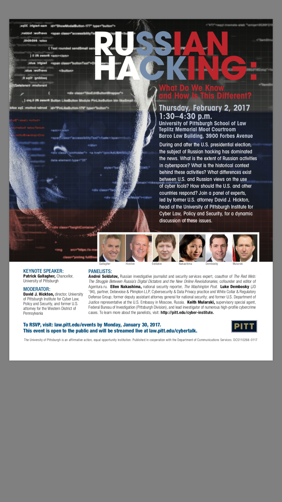 Hickton will lead a panel of experts in a February 2, 2017, in a discussion of “Russian Hacking: What Do We Know and How Is This Different?” The panel will be held at the University of Pittsburgh School of Law.