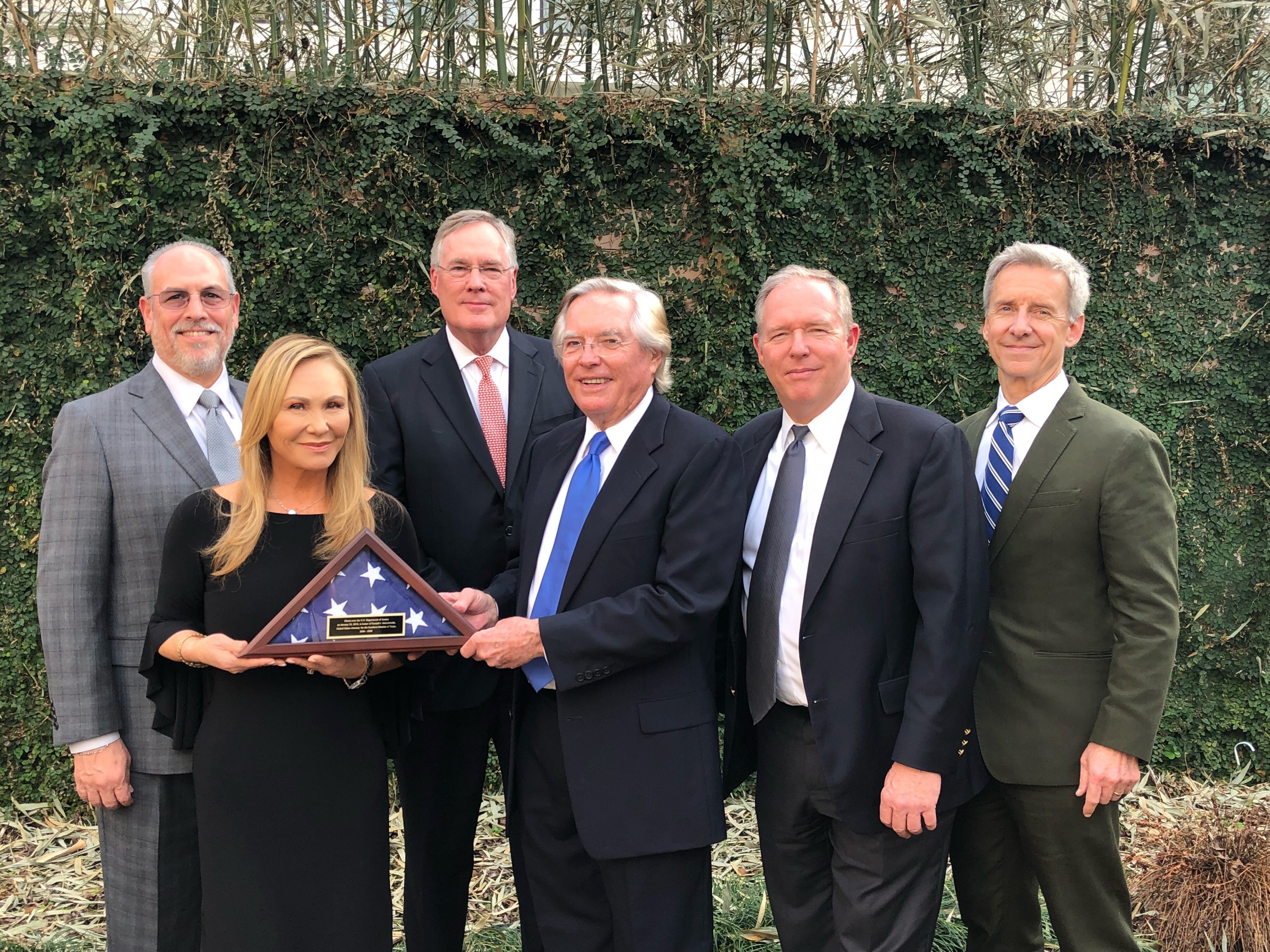 After Don’s funeral on Thursday, February 1, 2018 at the Second Baptist Church in Houston, a reception was held at the home of Tim and Nancy Johnson. After having presented the NAFUSA flag to Catherine DeGabrielle as part of the memorial service at the church, a photo was taken at the reception. The participants are left to right: Angel Moreno, U.S. Attorney, Southern District of Texas 2010-2011; Catherine DeGabrielle, widow of Don DeGabrielle, U.S. Attorney, Southern District of Texas 2006-2008; Tim Johnson, U.S. Attorney, Southern District of Texas 2008-2010; Ron Woods, U.S. Attorney, Southern District of Texas 1990-1993; Johnny Sutton, U.S. Attorney, Western District of Texas 2001-2009; Paul Charlton, U.S. Attorney, District of Arizona 2001-2007.