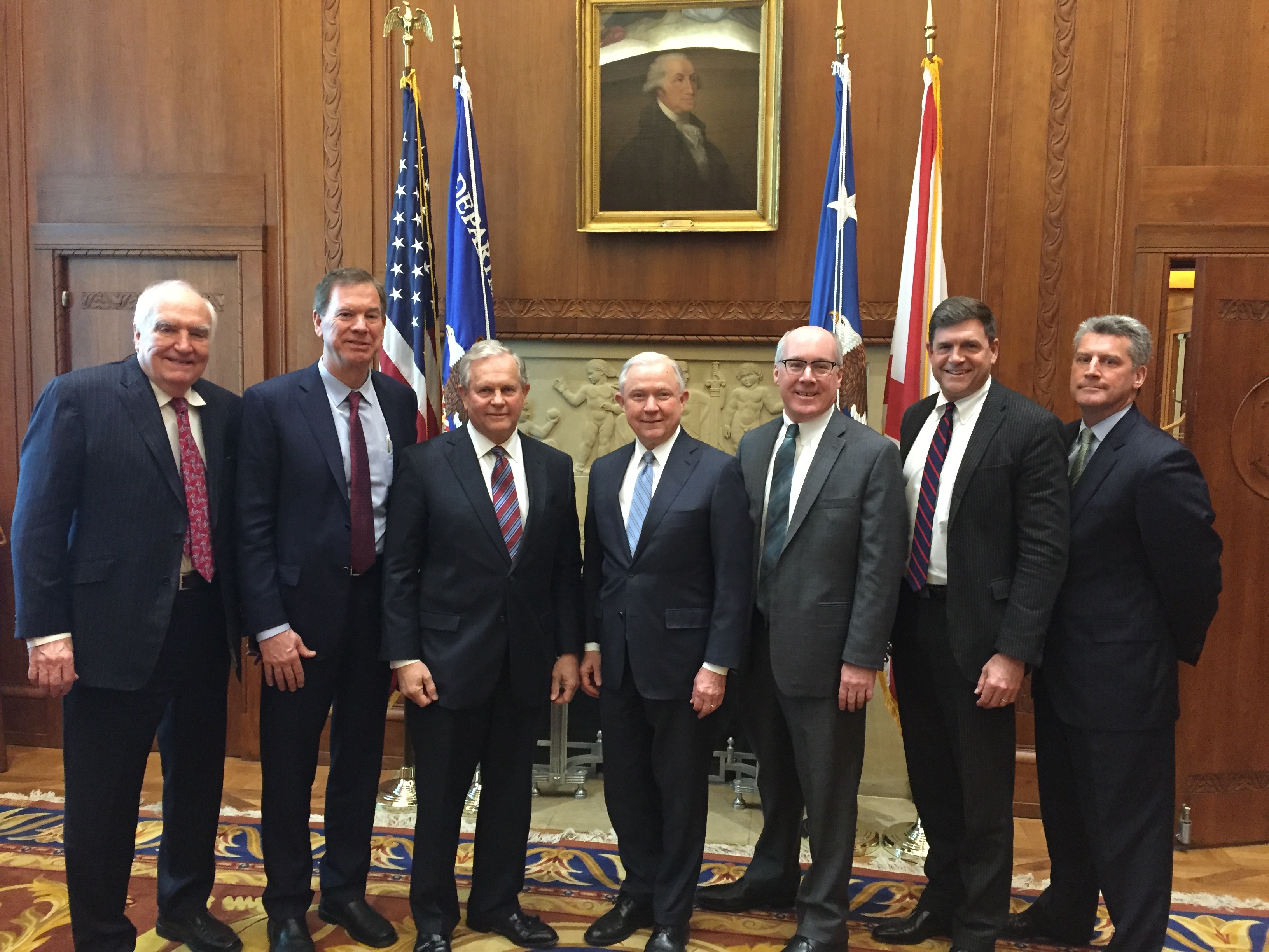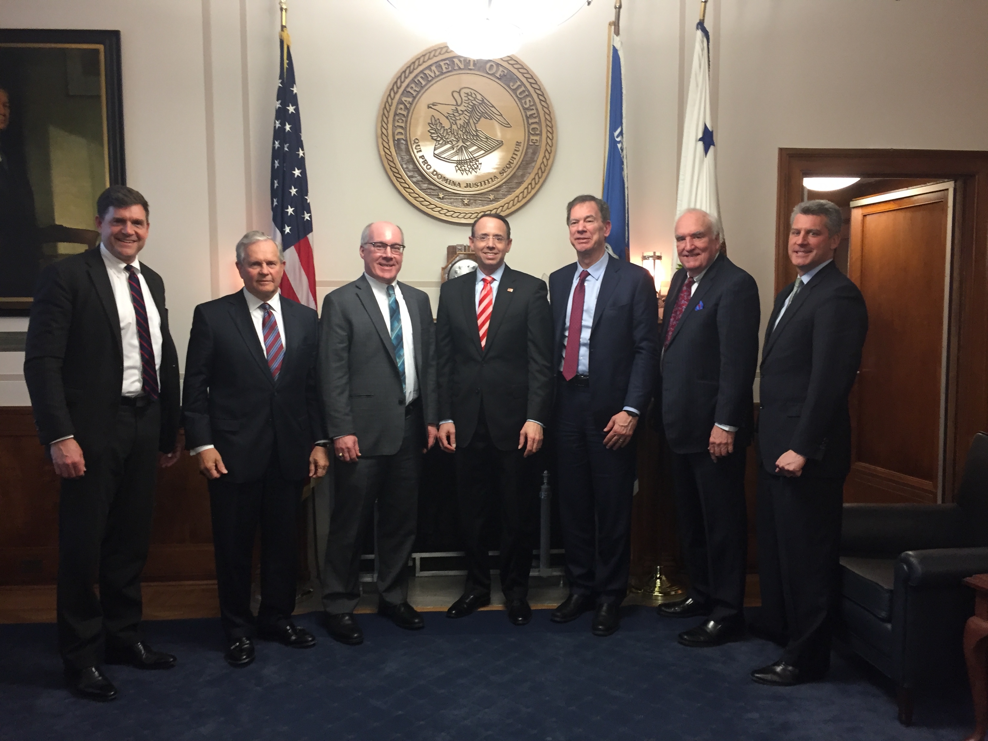 The photo below shows the NAFUSA delegation with DAG Rod Rosenstein in the DAG’s conference room. In all three meetings, the committee shared NAFUSA’s commitment to the U.S. Attorney community, and discussed NAFUSA’s desire to support the Department in a nonpartisan manner. The group also discussed the Bradford Award; the Wales Project; and how we have an American flag flown over Main Justice when a former U.S. Attorney dies and presented to the family as a token of the regard with which he or she was held by his or her former colleagues. There was also a discussion of the limitations on our taking public positions as an organization due to our nonpartisan and bipartisan nature.