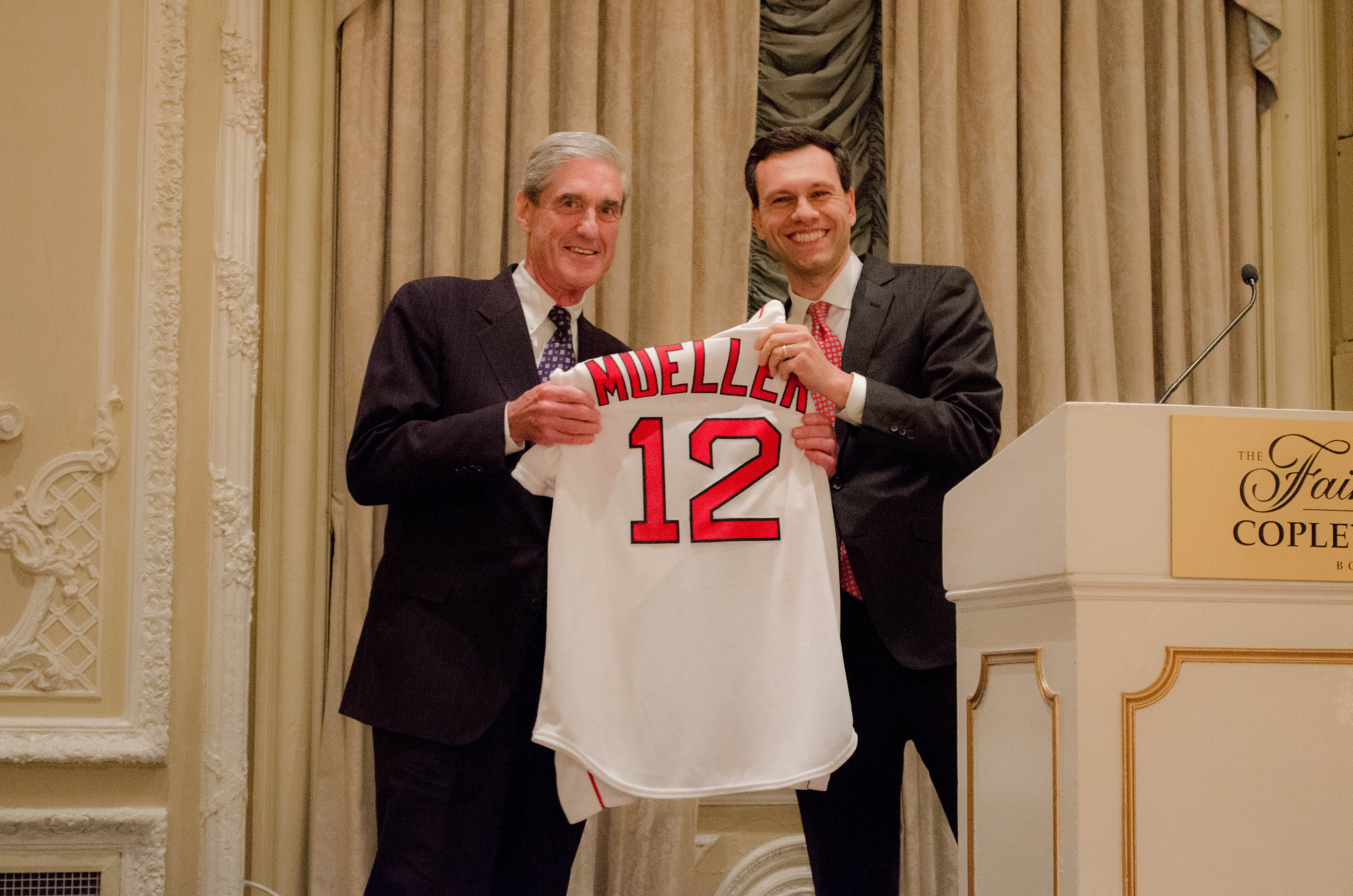 The NAFUSA annual conference was held in Boston October 9-11, 2014, and opened with a successful cocktail reception honoring Bob Mueller. NAFUSA President Don Stern contacted the Boston Red Sox after he learned that Bob was a true fan, and Red Sox Vice President David Friedman, shown below right, presented Mueller with a Red Sox jersey with his name and the number “12” representing Bob’s 12 years as the Director of the FBI and a bat autographed by the Red Sox manager, John Farrell.