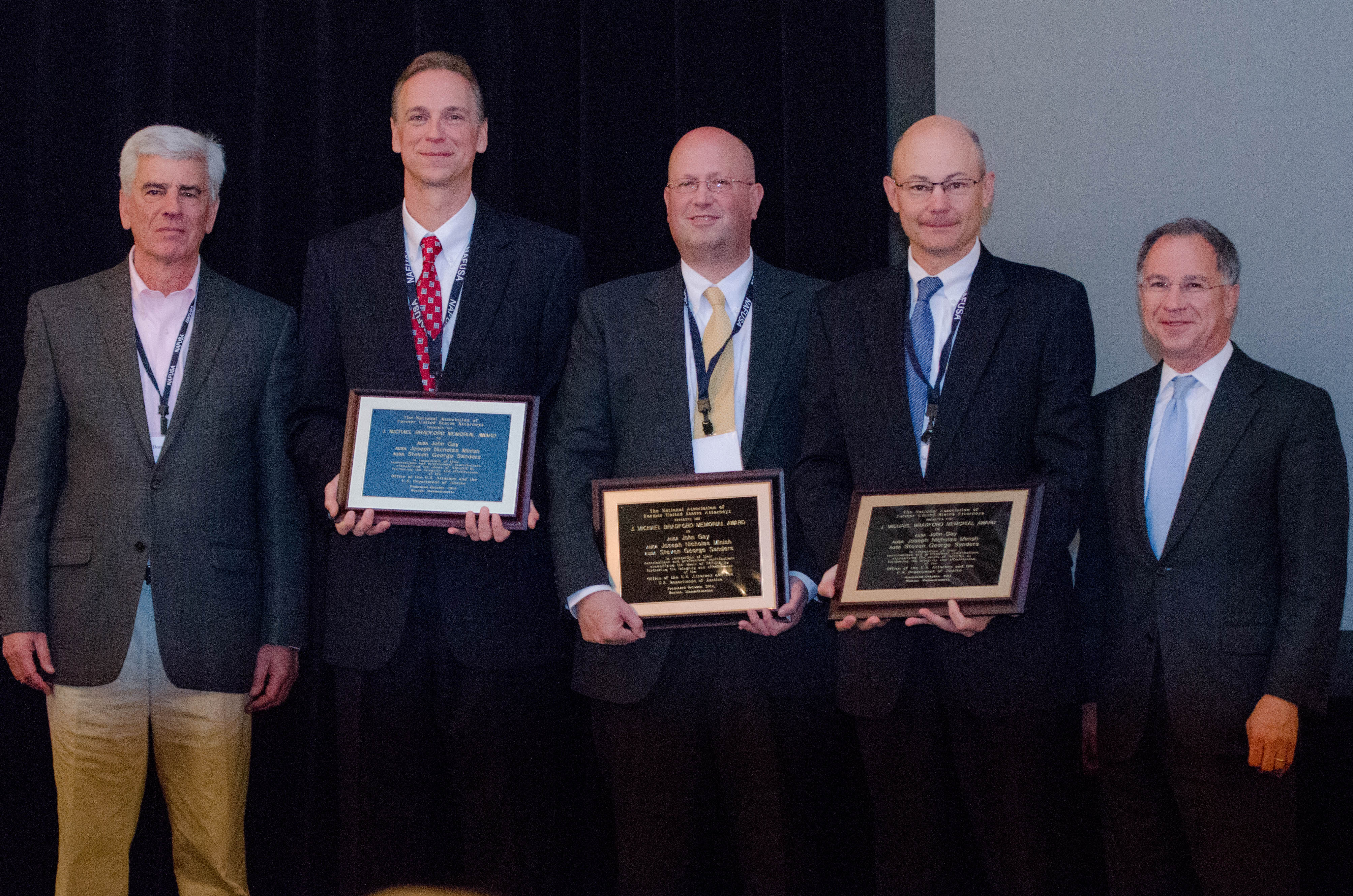 Once again, a number of exceptional nominations were made by U.S. Attorneys around the country. The Michael Bradford Award Committee was chaired by NAFUSA Vice President Greg Vega. Its members included Ed Dowd, Catherine Hanaway, Don Washington, Bart Daniel, Bob Cleary and Rich Rossman. This year, the Board voted to give the award to John Gay, Joseph Minish and Steven Sanders, from the District of New Jersey, nominated by United States Attorney Paul Fishman for their outstanding work in the case United States v. Paul Bergrin.