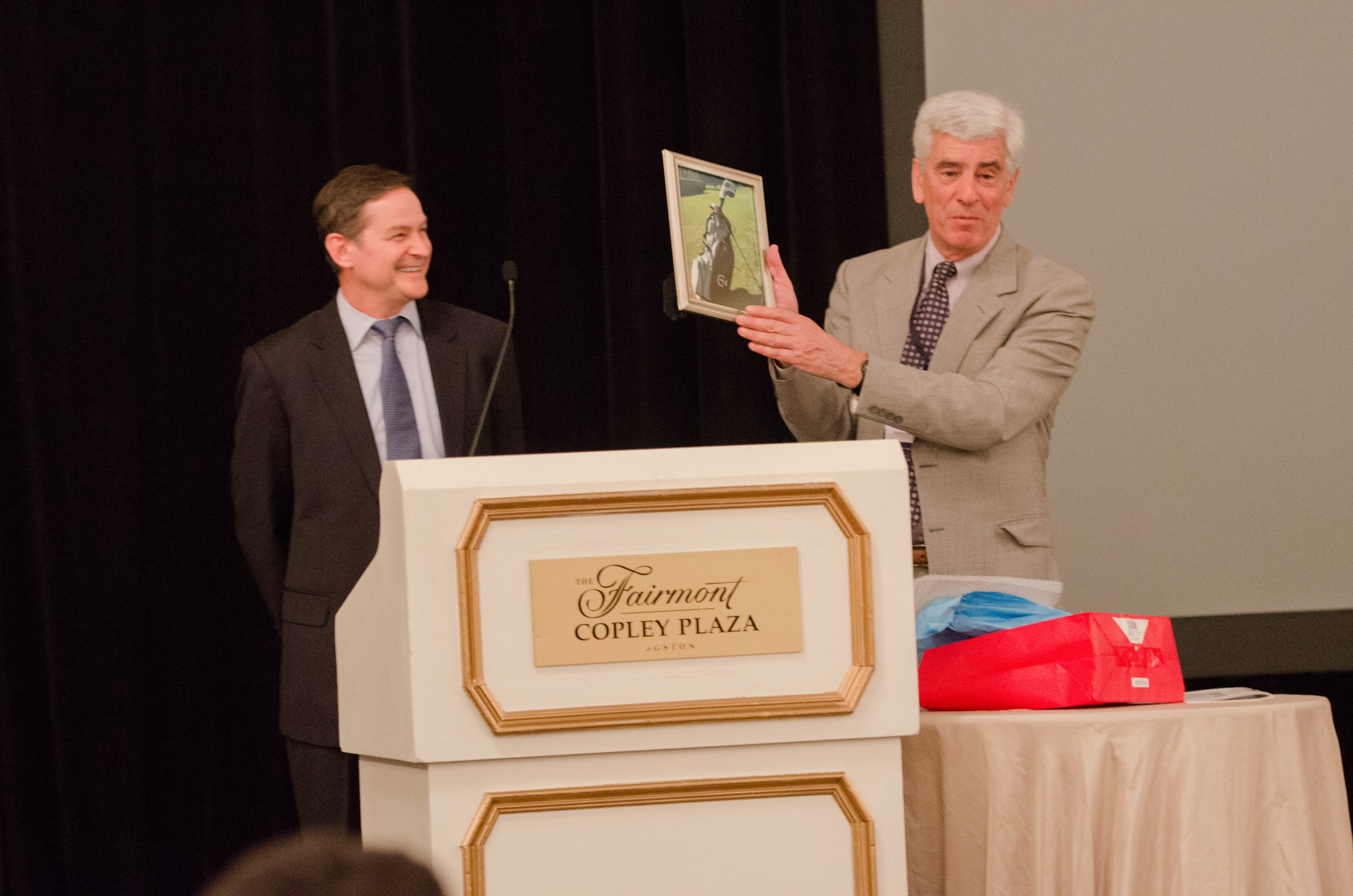 The conference concluded with a dinner and business meeting on Saturday night featuring the keynote address by Ed Davis, former Boston Police Department Commissioner, who spoke on “Lessons Learned from the Boston Marathon Bombing”. Don Stern turned the gavel over to Matt Orwig, the new president for 2014-2015. In the photo below, Matt is presenting Don with a gift of a new golf bag.