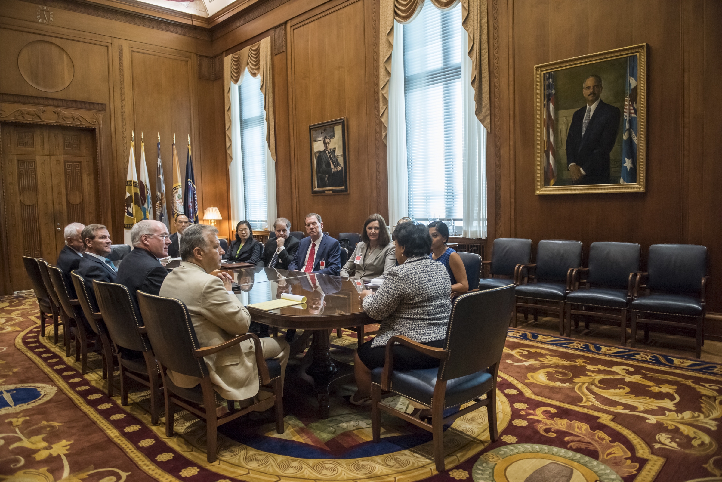 On July 23, 2016, The NAFUSA officers met with Attorney General Loretta Lynch in her conference room at Main Justice. The AG, who was an active member of NAFUSA in between her two appointments as U.S. Attorney for the ED of New York, is quite familiar with NAFUSA. She also chaired several meetings of the AGAC when they met with the NAFUSA Liaison Committee. In addition, she has attended NAFUSA conferences in her capacity as chair of the AGAC.